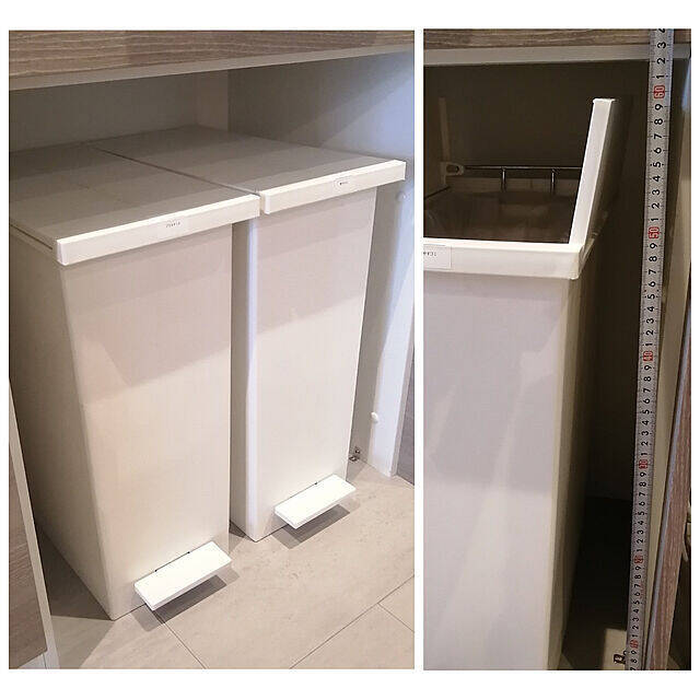 ユーザーさんは高さ62センチのカップボードの下に、27Lサイズのarrotsダストボックスをイン。実例からも分かるように、開いたフタの高さが10センチ程度と、とてもコンパクトです。フタが天板にあたることなく、しっかり開くので、ゴミが楽に捨てられますね。