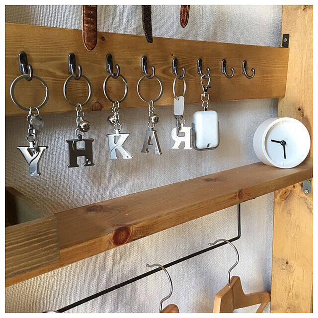 kanaさんは、ディアウォールで自転車のカギをかけるスペースを作られています。家族5人分のカギをかけられていますが、使うときにさっと取り出せそうです。家族それぞれのイニシャルのキーホルダーで見分けやすくされているところも、いいアイデアですね!ディアウォールでは、こんな小物の収納スペースも作れます。