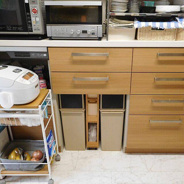カップボード下の空間に、ゴミ箱を2つ入れているユーザーさんです。2つのゴミ箱の間にできた隙間には、DIYで作ったレジ袋ストッカーを置いていました。ゴミ箱の側にレジ袋やゴミ袋を置くスペースがあれば便利ですよね!キャスター付きで出し入れも簡単だそうです。