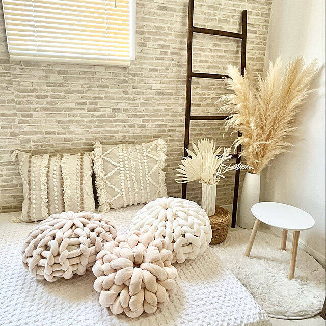 極太の毛糸で編んだ大きな編み目が魅力のチャンキーニットの小物類。nonさんは、淡い色合いの毛糸を使い、円形のクッションを手作りされています。ころんとした丸い形がキュートで魅力的ですね。優しい色でまとめられたインテリアに似合う、おしゃれな作品です。