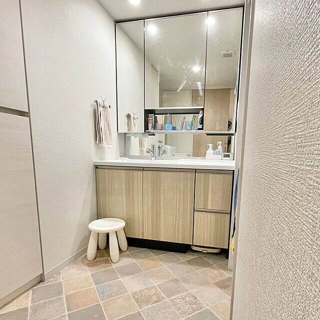 いろいろなユーザーさんのおうちで大活躍しているのが、リメイクシートです。nanacocoaloha-loveさんはリメイクシートを洗面台の扉に貼り、扉の取っ手部分も変更しました。ホワイトウッドが優しい色合いで、とても居心地よさそうです。
