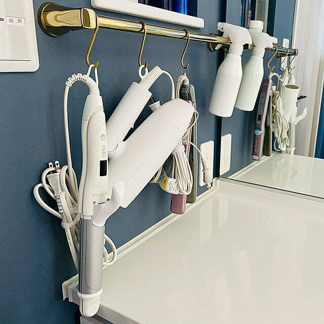 まず最初に、ヘアアイロンを吊るして収納しているユーザーさんをご紹介します。洗面スペースのちょっとした場所を有効活用し、フックや専用アイテムでヘアアイロンを吊るすことで、サッと取り出しやすく、機能的に収納できますよ!ユーザーさんのアイデアをご覧ください。