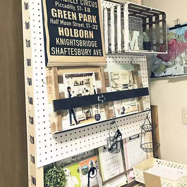 お家の形を模したユニークな有孔ボードの実例です。左下の部分にはワイヤーカゴを2段設置してポケットティッシュをぎゅぎゅっと収納していますね。全体がおしゃれなディスプレイボードに仕上がっていて、眺めているだけで気分が上がりそうです。