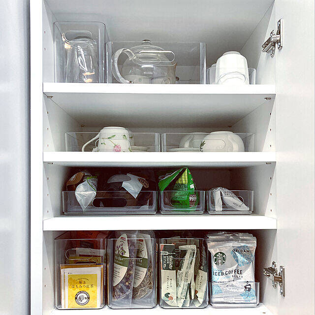 Ray_of_Lightさんは食器棚の中で冷蔵庫用の整理トレーを使ってコーヒーグッズを収納しています。ポットの近くにある棚に、来客時に使うものをまとめて収納することを決めたそうです。透明のトレーはなにが収納されているかすぐ分かるので使い勝手がよさそうですね。