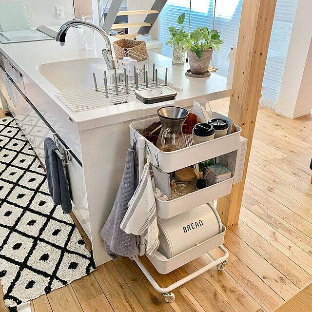 Minteaさんはワゴンを使って、コーヒーグッズを収納しています。グッズがまとめてあれば、コーヒーを作るときにラクチン。ワゴンだと使いやすい場所に動かせるのもうれしいですよね。ワゴンとキッチンの色に統一感がありスッキリして見えています。