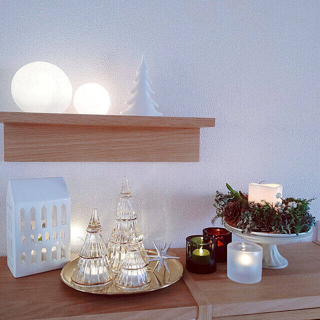 透明感があって美しいホルムガードのガラスのツリーを中心に、高さを変えて配置されたオブジェが上品な雰囲気を感じる、masumiさんのディスプレイコーナー。センスよく配置されたLEDキャンドルが、やわらかな雰囲気をプラスしています。ガラスのツリーの煌めきも、より一層アップしていますね。