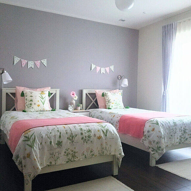 ベッドのカバーを着せ替え感覚で変えて、楽しんでおられるユーザーさんです。その時の気分に合わせて、月1~2回の頻度で変えているそう。今回は、ピンク色のベッドスローを使っておられました。グレーの壁紙で落ち着いたムードの中、ベッドスローがお部屋をパッと明るくさせています。