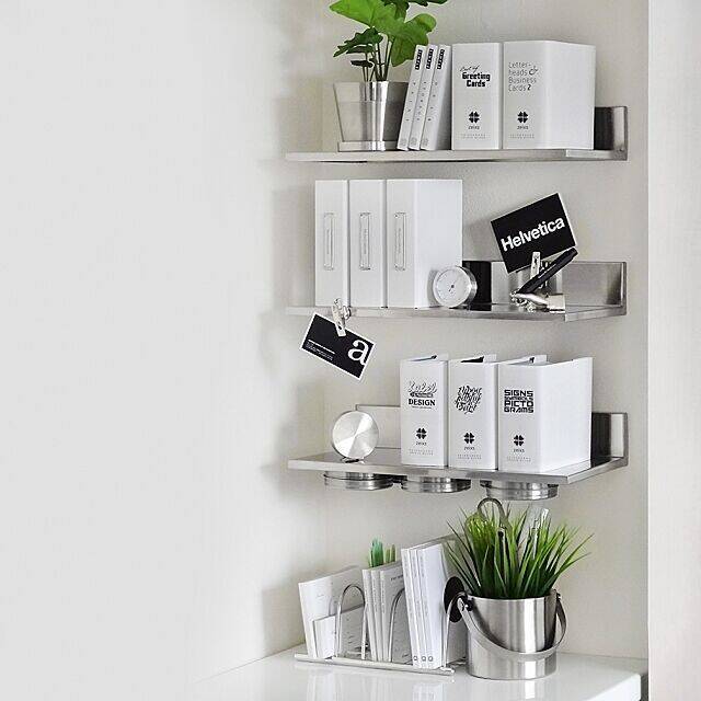 tuuliさんはデスク横の壁にIKEAのステンレス製の棚を取り付けました。モノトーンで統一された小物との組合せがとってもスタイリッシュ。無機質さの中にひと際鮮やかにはえる緑が印象的ですね。マグネット付きのケースをくっつけることもできて便利です。