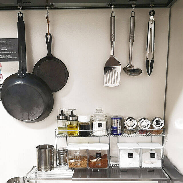 ryskさんは、マグネットフックを使って、キッチンツールを吊り下げて収納していました。真上から吊り下げても使えるので、場所を選ばず収納を作ることができますね。比較的重めのフライパンなどにも問題なく使えているんだとか。作業しながら片手でさっと取り出せる快適な置き場所がかないます。