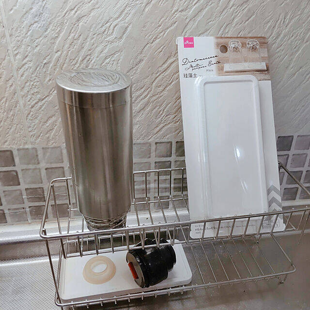 ダイソーの「珪藻土フリープレート」の長方形の形状と厚みが、ステンレスボトルラックにピッタリだったというtokiwaさん。カップや水筒のパーツの水受けとして、とても役立つそうですよ。洗い物を置くだけでなく、アイデアしだいで幅広く活用できそうな形状がうれしいですね!