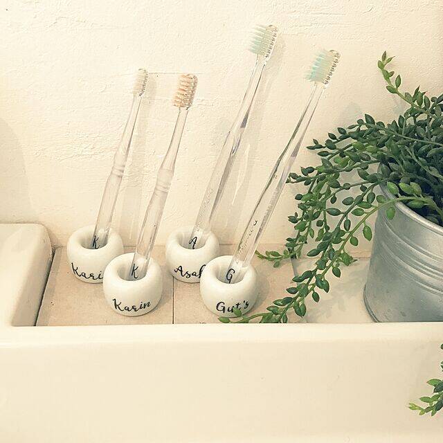 歯ブラシスタンドに、家族の名前を書かれたgo_slow_and_smileさん。シンプルなデザインの歯ブラシスタンドだからこそ、ご家族の名前がはっきりとわかり、間違うことなく手に取れそうですね。歯ブラシも色物をやめられたそうで、とってもすっきりとした空間になっています。