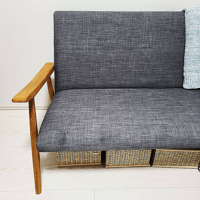 chikaさんは、ソファ下に無印良品のかごを入れこんでいます。中には、おむつやパソコンを収納しているのだそう。おむつはリビングに準備しておけば、取り換えもスムーズにできそうですね。インテリアなじみの良いかごなら、ちらりと見えてもおしゃれです。