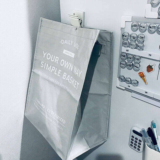 セリア「ランドリーバスケット」を使ってレジ袋収納にしていたのは、namekoさんです。マグネットクリップにはさんだバスケットの口は、ダイソー「超強力マグネットミニ」を使って留めているそうです。これなら出し入れもしやすく、すっきりと見せられますね♪