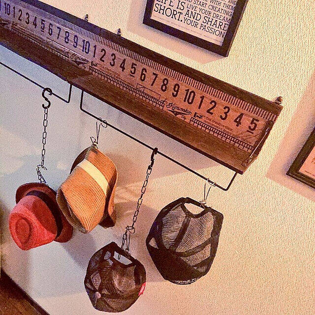 壁面でセリアのアイアンウォールバーを使っている実例です。アンティークなウォールシェルフの下にバーを固定し、S字フックとインテリアチェーンをかけています。高さを調整することで、吊るしてある帽子同士がかさばりません。見栄えばっちりの見せる収納が完成しています。