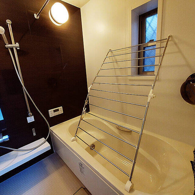 yuki_ougaさんは、ストリックスデザインの室内用物干しを使っています。実例のように、伸ばすと浴槽のフチに立てられるようになっています。意外とスペースが限られるバスルームを、便利なアイテムでうまく部屋干しに活用できていますね。