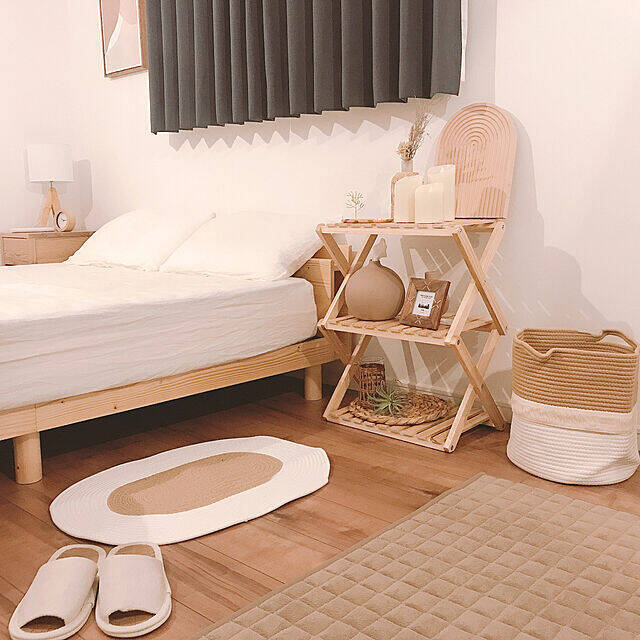 寝室を韓国風インテリアにコーディネートしている、mmhomeさんです。コーナンラックをベッドサイドに置いて、キャンドルライトやフラワーベースを飾っています。木製のラックが、ベージュでそろえたインテリアに自然素材の風合いをプラスしています。