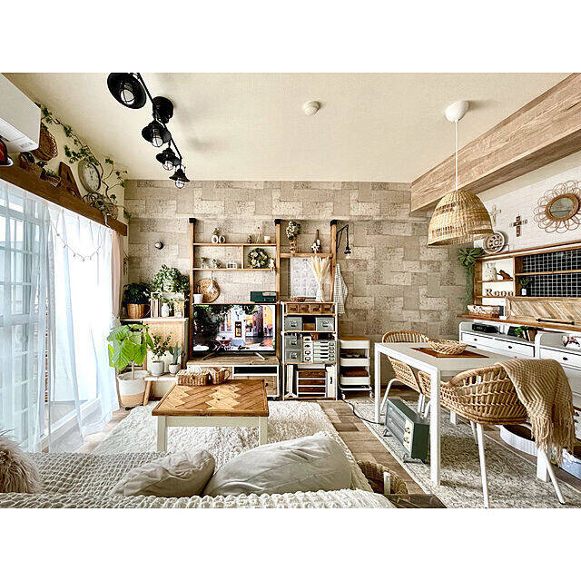 柔らかな色味でお部屋を統一されている、airararaさんの実例です。右上の大きな梁は、壁紙をご自身で貼って「なんちゃって梁」にされているのだそう。向かって正面の棚も梁部分を上手に活用して設置しており、お部屋の凹凸を素敵にアレンジされています。