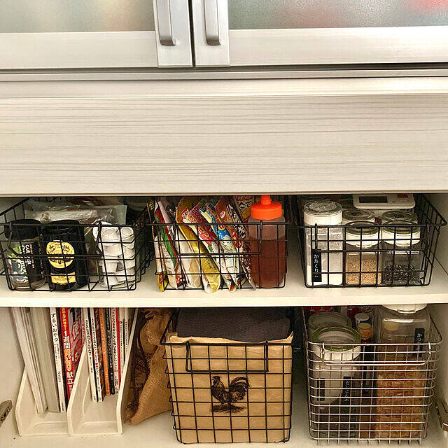 キッチンの戸棚の上段に、ニトリのワイヤーバスケットを組み合わせて収納されている、mako2yaさん。スペースにピッタリのサイズ感やフレッシュロックとも相性がよいことが、お気に入りのポイントだそうですよ!乾物や調味料がスッキリと収まった、気持ちのよい空間ですね。