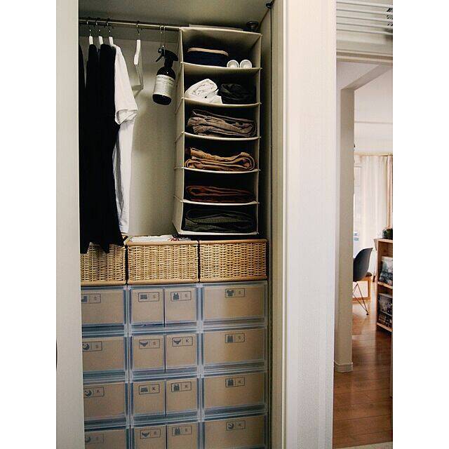 無印良品でも人気の「PPクローゼットケース引出式」をクローゼットの中に設置されているMegumiさんです。こちらはケース1つ1つを好きに組み合わせることができるので、パイプに掛けたアイテムの長さに合わせて、下の空間をフルに収納として活用できます。