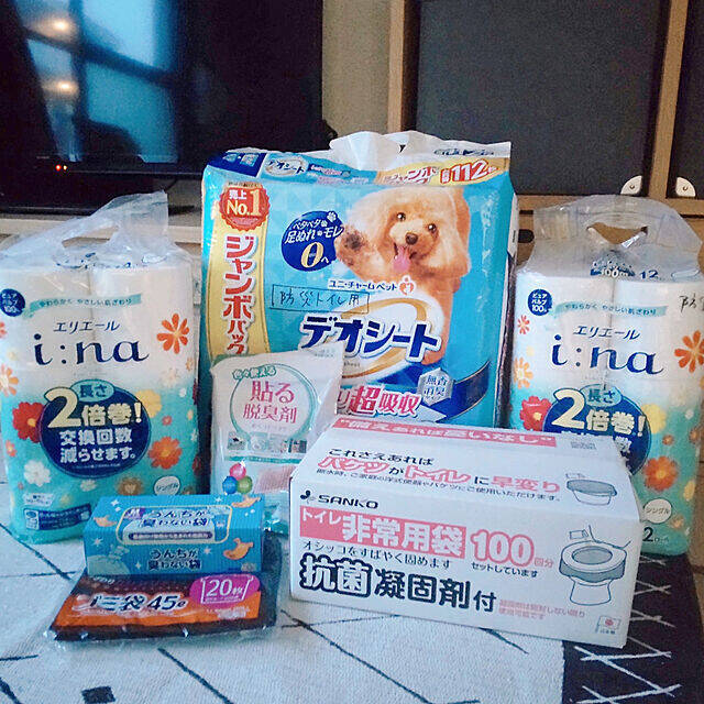 こちらのお家では、非常用のトイレを複数用意しています。まず第一に、ペットシーツを吸水シートとして使うというもの。それに追加で防災用トイレ非常袋100回分も用意しています。複数用意しておくことで、片方がうまくいかなくても保険がききますね。
