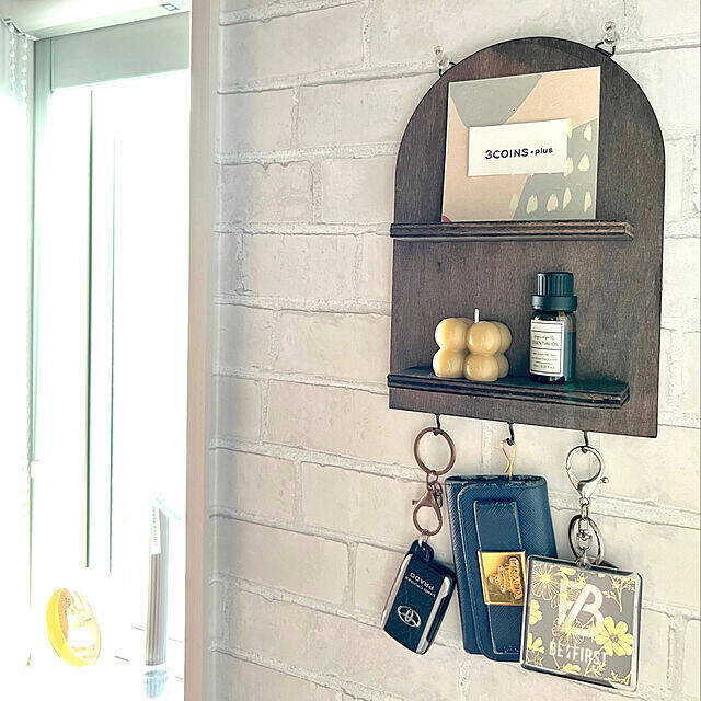 玄関の壁掛け収納をDIYされた、____pir.y.oさん。3COINSのディスプレイアーチラックに、吊金具とランプフックを取り付けて作成されています。ひとつの場所で小物のディスプレイと車のキーや時計を引っ掛けることが可能になりました。これでスッキリ収納ができますね!