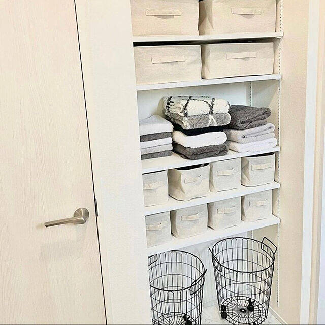 saa.houseさんは、洗面所の収納を無印良品のポリエステル綿麻混ソフトボックスで統一しています。布製ボックスでやわらかく、軽量なところも使いやすくて◎。コンパクトにたためるのも便利です。乾燥機で乾かすものをほぼすべて収納しているとのことで、効率的な収納法も参考になります。