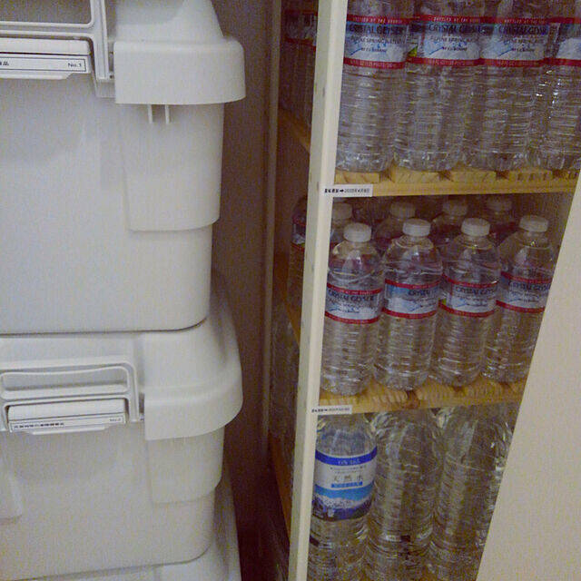 Himeさんは大量のお水を備蓄しています。容量の違うペットボトルをいくつかそろえておくことで、飲料用や手洗い用など用途に応じた使い分けがしやすそうですね。棚に使用期限のラベリングをして、期限切れ防止をするアイデアもマネしたくなります。