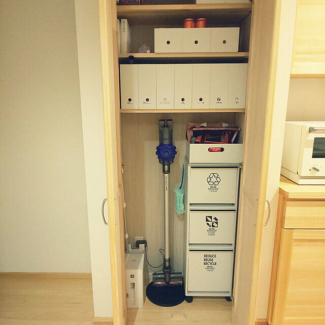 こちらのユーザーさんは、リビング収納の中に、3段の「資源ゴミ分別ワゴン」を置いていました。キッチンの隣にある場所とのことで、使い勝手も良さそうです。3段あるので容量も安心。収納庫の扉を閉めてしまえば、ごみが全く見えないのもうれしいポイントですね。