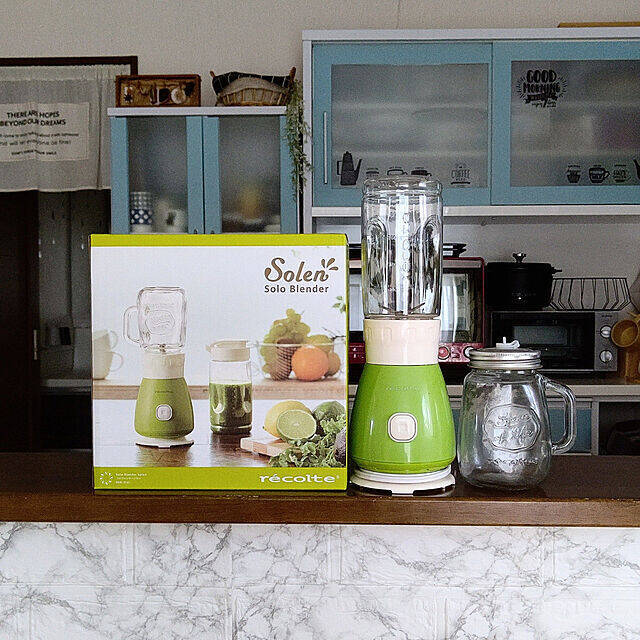 1~2人用でおすすめなのがrecolteのソロブレンダーソラン。ガラスジャーと軽量で持ち運びしやすいトライタン製ボトルが選べる2WAY仕様です。mi-ya.hymさんが選んだのはキッチンのアクセントになる明るいグリーン。出したままでもかわいく、コンパクトで洗うのも苦にならないと教えてくれました。