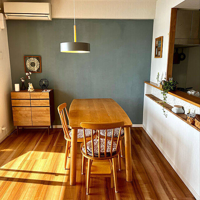 木目の美しい床やテーブルが印象的な実例です。奥の壁には味わいのあるブルーグレーのくすみカラーを採用しています。自分の納得いくカラーになるよう色を混ぜて塗ったそうで、質感が魅力的ですね。日溜まりが美しく、心地いい時間を過ごせそうです。