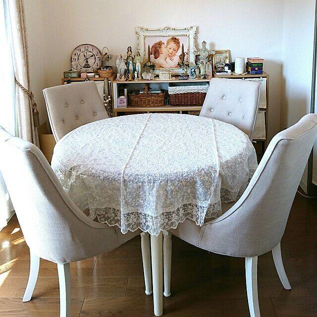 お屋敷の一角と見まごうようなこちらの実例。ラウンドテーブルを囲うのは4脚のラウンジチェアです。ゆったりした背もたれで、座り心地もよさそうですね。シャビーホワイトで統一された空間にうっとりです。