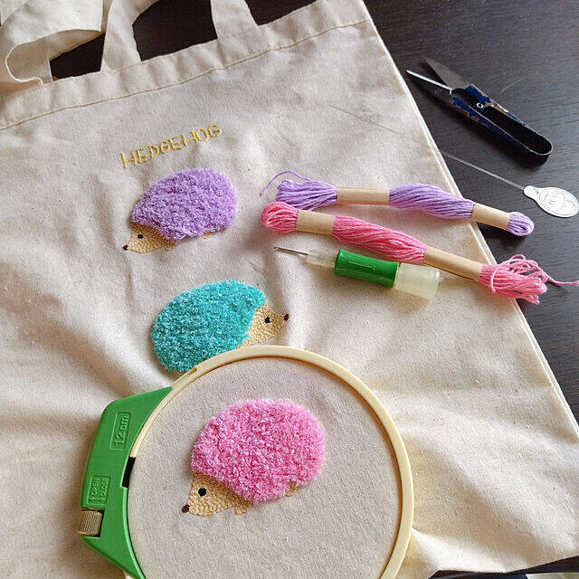 無地のバッグに、パンチニードルでハリネズミの絵柄を刺繍されていた、mariyaさんの実例です。背中のモコモコとした仕上がりは、パンチニードルだからこそ出せるもの。ハリネズミのハリの立体感が毛糸でキュートに再現されています!
