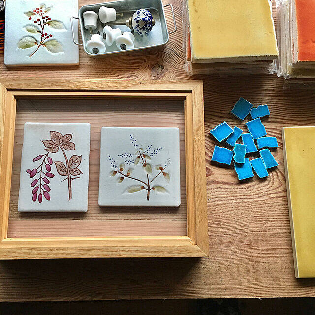 お気に入りの柄のタイルは、眺めているだけでハッピーな気持ちになれますよね。ALICEさんは、タイルを額縁に入れてDIYされました。植物モチーフのタイルと木目の額縁が、相性バッチリですね。ナチュラルな作品に仕上がりました。