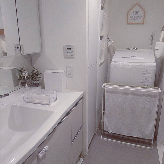 洗面所はすっきり見えるようホワイトで統一し、スリムなものを選んで購入されているという、Sakuraさん。洗面台の上に置かれているニトリのゴミ箱は、スリムで外から袋が見えないところがお気に入りとのことです。プッシュ式で、使い勝手もよさそうですね。