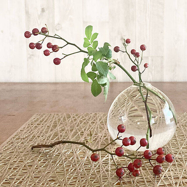 癒しの空間に、植物や生花を飾ってみてはいかがでしょうか。こちらは、松野栄治さんの「みずのうつわ」です。chachamama さんは、野薔薇の実を生けていらっしゃいます。光の加減で表情が変わるのもポイント。お花を引き立ててくれるフラワーベースです。