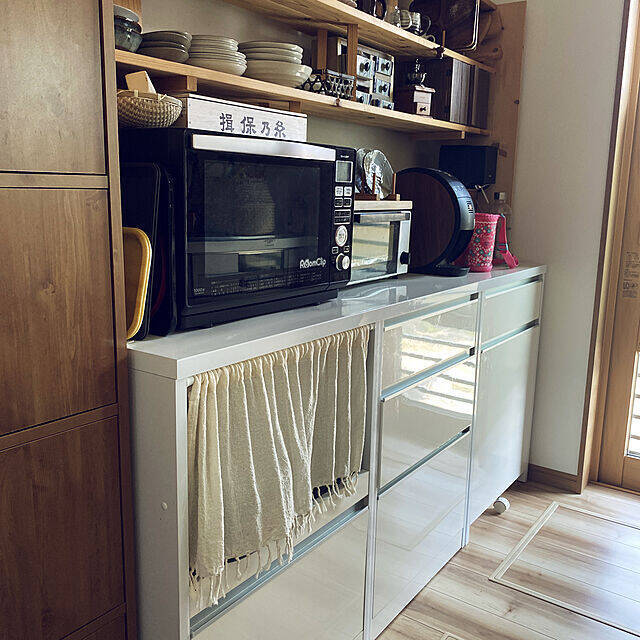 はじめにご紹介するのは、ちょっとした場所の実例です。オープンラックや壁面収納棚など、モノが集まるスペースに目隠しをしてみませんか?スッキリ見える上に、ホコリ防止にもなって一石二鳥なんです。では、4つの実例を見ていきましょう。