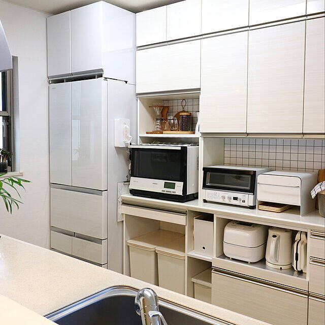 tomoccoさんは、冷蔵庫上のスペースを有効活用。過去に使っていた食器棚の材料を活用した収納ラックをDIYされています。熱がこもらないよう、また地震のときにも物が飛び出さないように設計されているとのこと。安全性も高いアイデアとなっています。