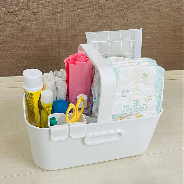 na_y_o04さんは、ニトリのソフトNインボックスにハンドルパーツを取り付けて、持ち運べる仕様にされていました。ボックス内にはおむつのほか、さまざまなお世話グッズをまとめています。ハサミなどの小物は、中で倒れないようにポケットに入れて分ける工夫も。必要なときにサッと持ち運べて、とても便利そうです。