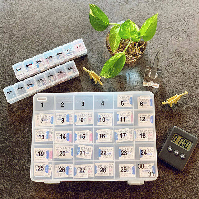 セリアの「SIKIRIシリーズ」で薬を収納されている、ntayさんの実例です。収納ケースには数字のシールをプラスすることで、いつ飲む薬なのかを明確にされています。クリアタイプの収納アイテムは、きちんと飲めたか否かもすぐに確認できるのがメリットですね。