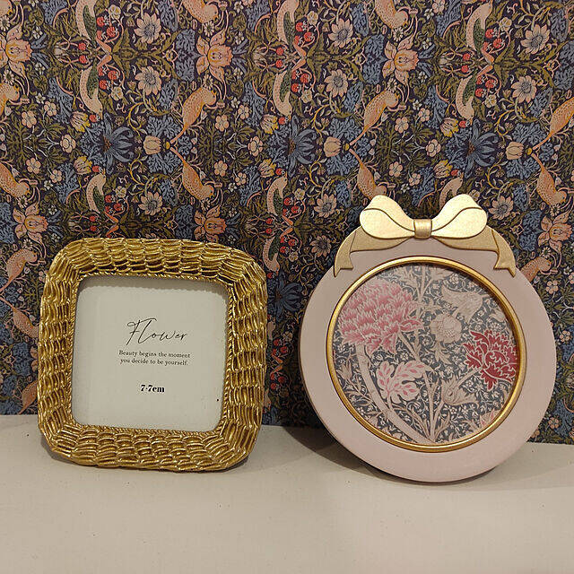 淡いピンクとゴールドのリボンモチーフが印象的な、セリアのフォトフレームを愛用されているchisaさん。中には、ウィリアムモリスのコラージュペーパーをセットしています。ゴールドのフレームは、3COINSで購入されたものだそうです。どちらも高級感があり素敵ですね。
