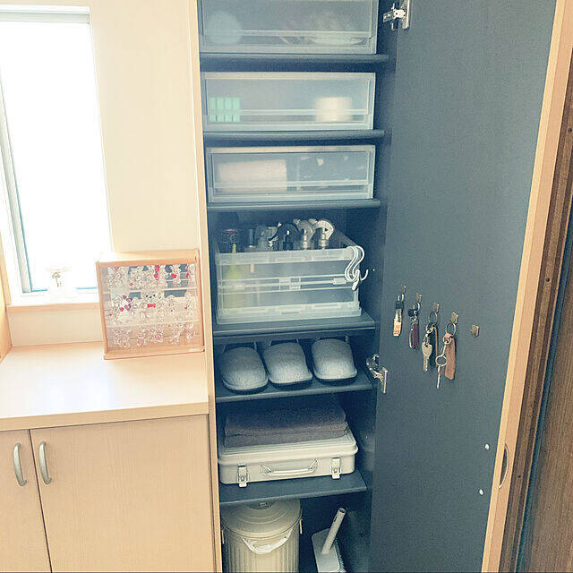 tata-kukuさんは靴箱とは別に、玄関収納としてカラーボックスを置いているそうです。最上段には無印良品のスチール工具箱1を置いて、鍵を収納しているとのこと。ポンっと入れるだけの鍵置き場は、使い勝手がよさそうです。