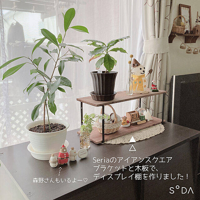 -Riley-mama.-さんがDIYされた棚は、実はセリアの材料3つでできるという画期的な作品。ブラケットと木板をネジで止めるだけでできるのだそうです。ダイソーのものというニスも塗って、高見えする作品に仕上げています。