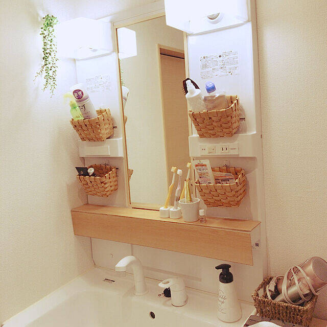 kyoro_homeさんは洗面台の鏡や棚に、両面テープで木板を貼って木製風にリメイクしました。洗面所がグッとナチュラルで明るい雰囲気になりましたね。両側のバスケットもS字フックで吊るしているだけなので、簡単に元の状態に戻すことができます。
