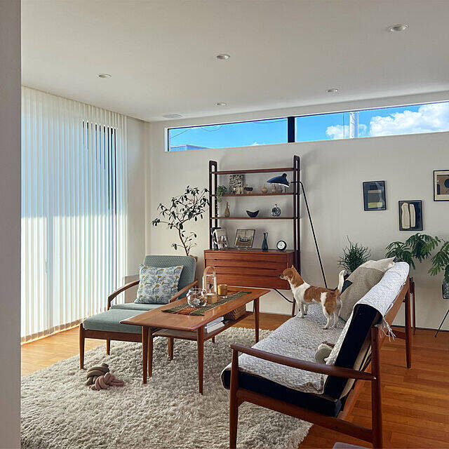 casa_omameさんのリビングは、北欧スタイルを取り入れた明るい空間です。毛足の長いラグや大きなグリーンでコーディネートしており、温かい雰囲気が魅力的ですね。窓辺にはバーチカルブラインドを使い、ステイリッシュさがプラスされています。