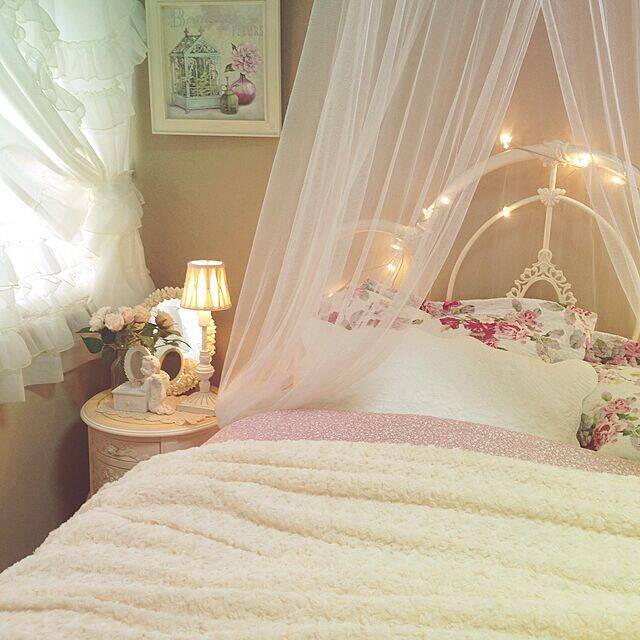 ふわっとしたレースの天蓋ベッドが印象的なyumicyanさんの寝室です。窓辺のレースカーテンと天蓋のレースからは神秘的で洗練された雰囲気を感じます。また、白とピンクを基調としたガーリーな色使いは、華やかで優しい印象を与えてくれますよ。まるで海外映画のお姫様になった気分を味わえそうな空間です♡