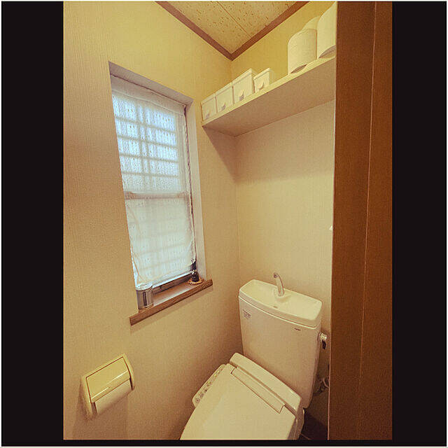 収納する入れ物や、カーテンを白でまとめ、清潔感あふれる空間となっています。アイテム数を絞り込み、掃除しやすく工夫しています。トイレはやはり清潔感があるほうが、気持ちいいですよね。窓枠に置かれた小物がアクセントになっています!