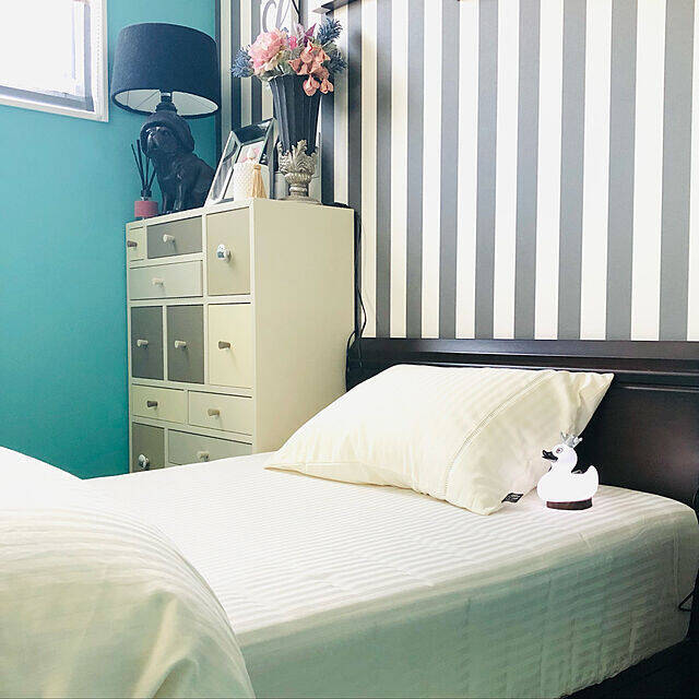 メリーナイトのピローケースを使用されているkotarico327さん。なめらかで光沢感のある素材で高級感があります。さりげないサテンストライプもGood。ストライプ柄の壁紙との相性もばっちりです。お気に入りのインテリアに囲まれて眠りにつくひとときは最高ですね。