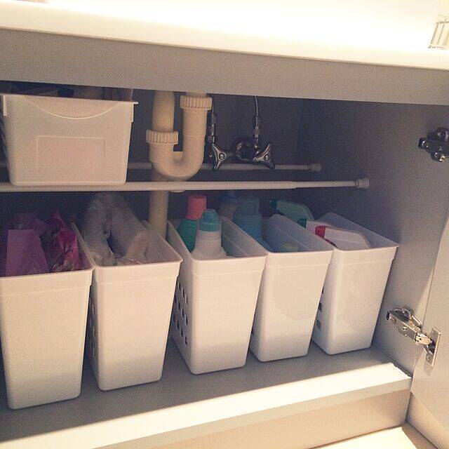 すきま収納ボックスを5つ並べて、洗剤やストック品を収納されているユーザーさん。排水管があるものの、同じ収納ボックスを使っているので、スッキリして見えますね。また、洗剤の詰め替えなどは自立しにくいものもあるので、容器に入れたほうが収納しやすそうです。