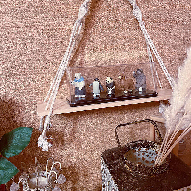 整列して歩いているような姿が微笑ましいy.hさんのガチャガチャフィギュア。ナチュラルでエキゾチックな雰囲気が漂うマクラメの壁掛け棚に乗せて、「見せる収納」をされていました。埃よけや転倒防止に、ダイソーのディスプレイケースに入れて保管。お手入れのしやすさも叶える素敵なディスプレイですね。