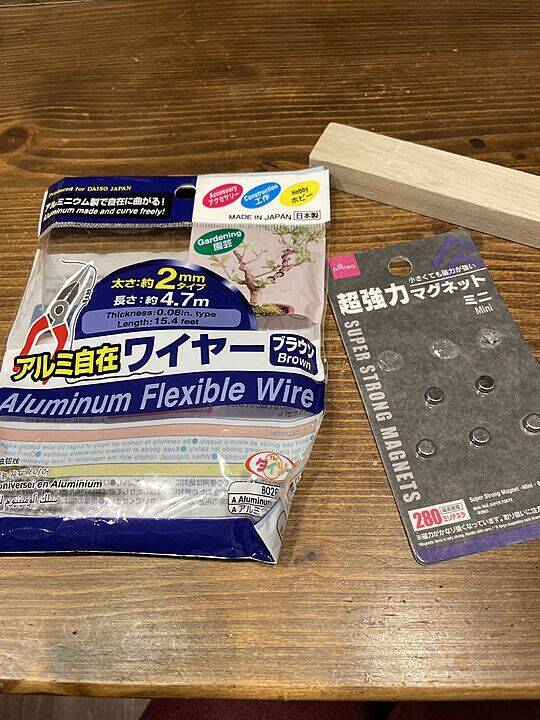 木材 25×450mm(※厚みは1cm以上あればOK)【ダイソー 売場:DIY材(スノコ、工具、フック等)】アルミワイヤー 2mmタイプ【ダイソー 売場:DIY材(スノコ、工具、フック等)】磁石 超強力マグネットミニ【ダイソー 売場:オフィス/文具】■必要な道具